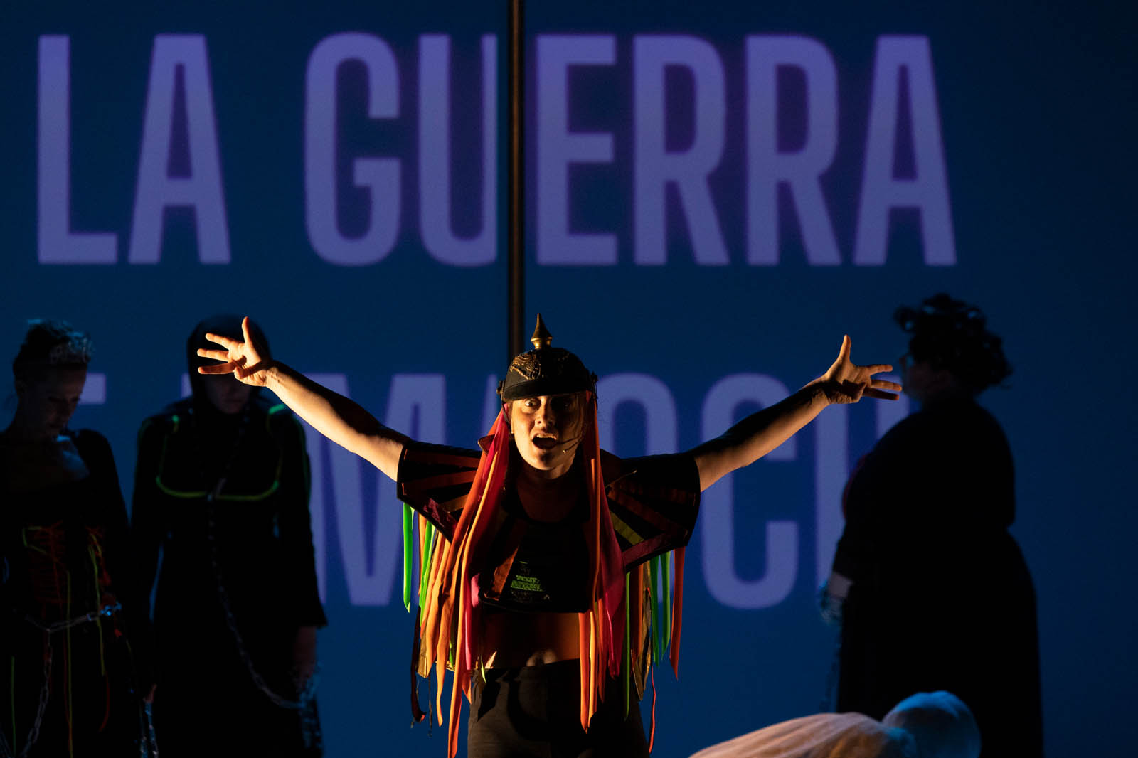 Ė a questo punto che inizia la vera e propria rappresentazione de Le Troiane: attorno a un alto palo, che simboleggia il fallocentrismo della cultura occidentale, ruotano le vicende tragiche di Ecuba, che verrà assegnata a Ulisse, di Cassandra destinata ad Agamennone, di Polissena da immolare sulla tomba di Achille, di Andromaca “preda” di Neottolemo e di Elena, che dovrà tornare da Menelao (ottime le interpretazioni di Eva Robin’s, Noemi Bresciani, Ana Facchini, Ira Fronten, Luce Santambrogio e Marcela Serli). Implacabile la sventura si abbatterà anche sul piccolo Astianatte, a riprova che l’espressione “Prima le donne e i bambini” evidenzia semplicemente i bersagli privilegiati dell’efferatezza bellica. I monologhi delle protagoniste, atterrite all’idea di ciò che dovranno patire dopo aver già perso gli affetti più cari, fanno comprendere che in guerra non ci sia modo di sottrarsi alla “legge della sopraffazione maschile”. Nessun premio per chi, incarnando le più tradizionali virtù muliebri, crede di poter salvare vita e onore, nessuna equità di giudizio verso chi, spinta all’adulterio, finisce poi per essere condannata da un tribunale di “eroi”, fedifraghi e ipocriti. La doppia morale, il gaslighting, il controllo e la violenza sui corpi delle donne sembrano ineluttabilmente intrecciati alle più tragiche vicende umane.
